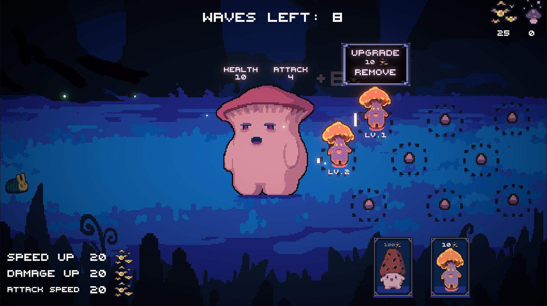 Your task is to protect the old mushroom and fend off waves of enemies until your allies find a cure.